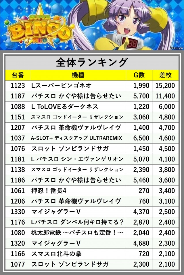 厳選された取材対象機種をはじめ、その他スロット全体から好記録が飛び出した!プレイヤーが楽しんだ1日を下記データにて振り返ってみて欲しい。