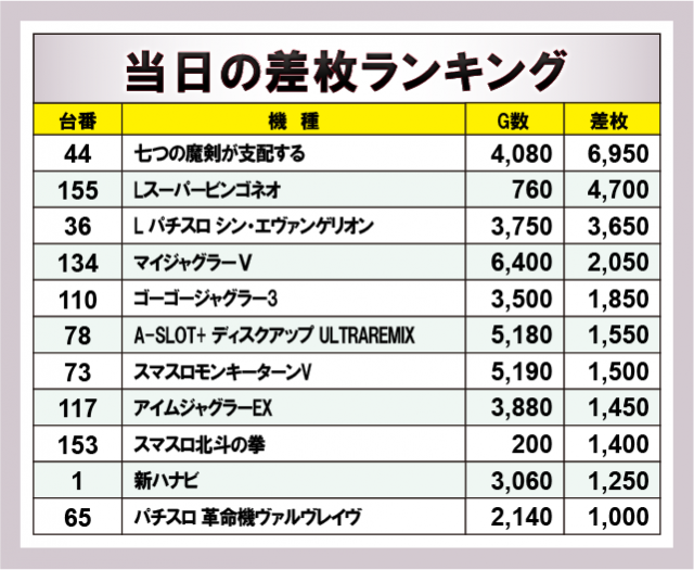 新台として登場間もないさらに『七つの魔剣が支配する』で+6,950枚をマーク。さらに『Lスーパービンゴネオ』で4,000枚OVER、『L パチスロ シン・エヴァンゲリオン』で3,000枚OVERと追随するなど、各所で大きな盛り上がりを披露していた。