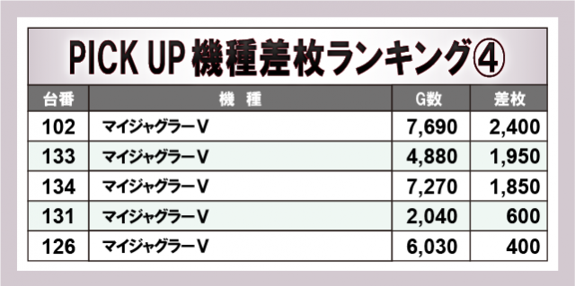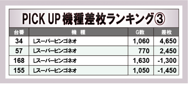 『Lバンドリ!』『パチスロ からくりサーカス』『Lスーパービンゴネオ』『マイジャグラーⅤ』から優秀台が生まれ、ファンが自信をもってレバーを叩いていた様子が目に浮かぶ。またスマスロ機からノーマルタイプまでいずれも同店が丁寧に扱っていると窺うことができ、今後も要注目のエリアなのは間違いないだろう。