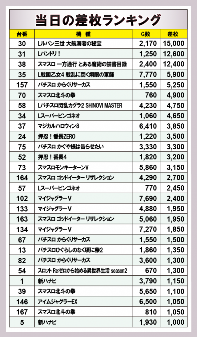 『Lルパン三世 大航海者の秘宝』『Lバンドリ!』『スマスロ 一方通行 とある魔術の禁書目録』から計3台の万枚OVERが発生。さらに『L戦国乙女4 戦乱に閃く炯眼の軍師』『パチスロ からくりサーカス』で5,000枚OVERも確認でき、大きな盛り上がりに包まれていたのは間違いない。これらのほかにもプラス4桁差枚を獲得する台が多く存在しており、ファンは有意義な時間を過ごしていたことだろう。