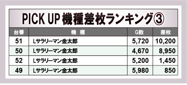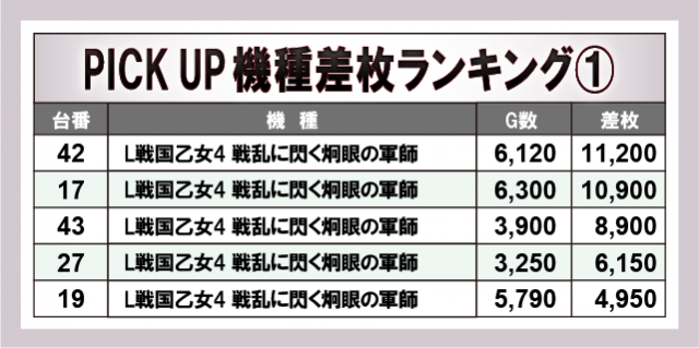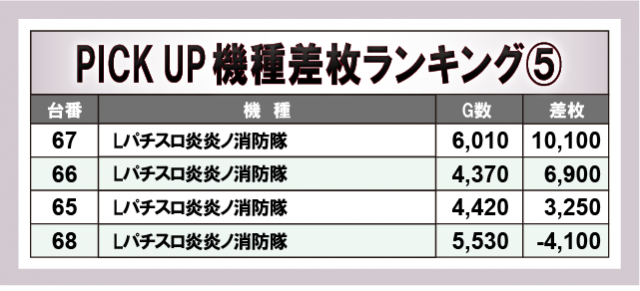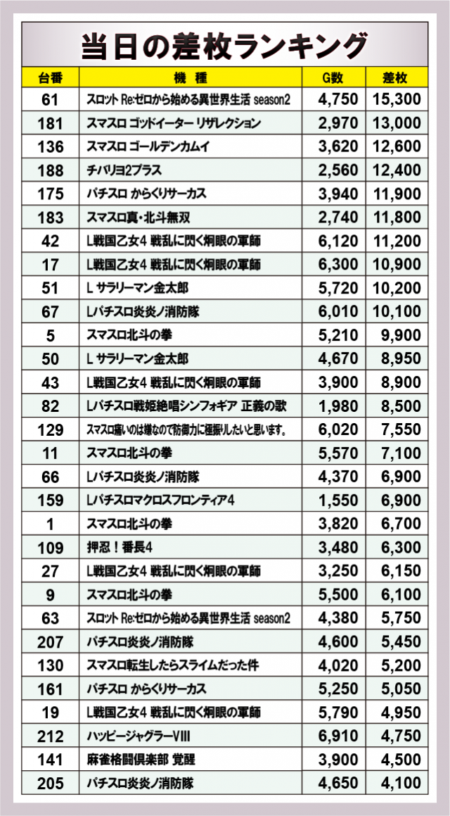 万枚OVERを達成した『L戦国乙女4 戦乱に閃く炯眼の軍師』『スマスロ北斗の拳』『L サラリーマン金太郎』『スロット Re:ゼロから始める異世界生活 season2』『Lパチスロ炎炎ノ消防隊』は、全体的にプラス差枚台の割合が高くなっており、ファンはすぐに手ごたえを感じては時間の許す限りレバーを叩いていた様子が窺える。