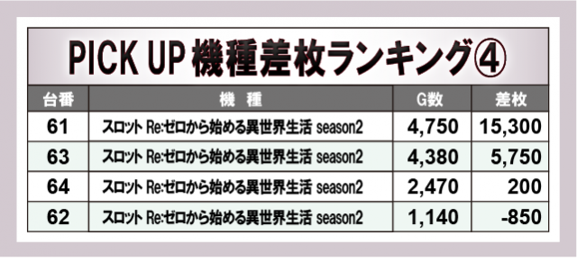 『スロット Re:ゼロから始める異世界生活 season2』を筆頭に計10台の万枚OVERが発生し、各所から大きな熱量が確認できた。さらに上表は4,000枚OVERからとなっており、大きな熱気にファンは笑顔をこぼしていたが、それもまた、打ちごたえのある状況が相まってのことだろう。