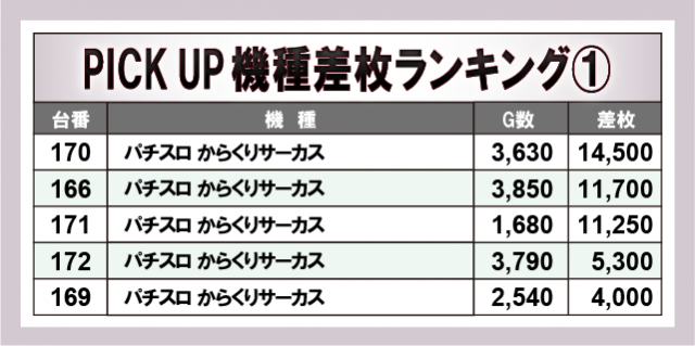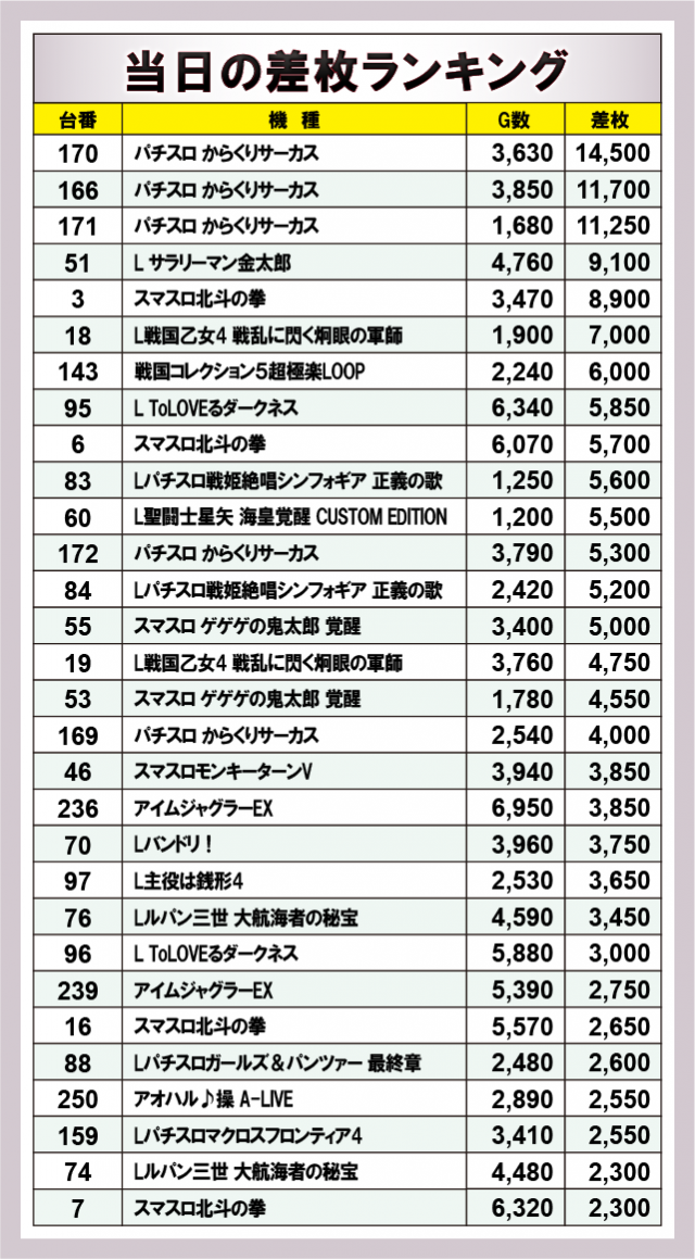 当日は『パチスロ からくりサーカス』から3台の万枚OVERが発生!そのほか大台突破台が多数確認でき、店内は凄まじい熱気に包まれていたのが分かる。上表だけでも2,000枚OVER台が名を連ねており、ファンは右肩上がりに伸びる出玉を前にしては、興奮を抑えきれなかったことだろう。
