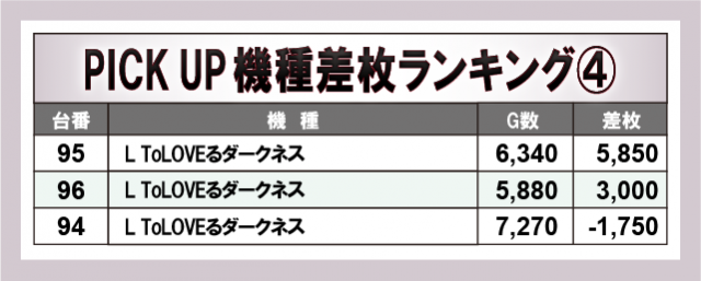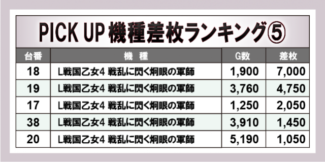 続いて優秀機種に目を向けると、複数のプラス差枚数を築いた台が目立っている。万枚OVERを達成した『パチスロ からくりサーカス』は言わずもがなの活躍で、その他『スマスロ北斗の拳』『スマスロ ゲゲゲの鬼太郎 覚醒』『L ToLOVEるダークネス』『L戦国乙女4 戦乱に閃く炯眼の軍師』から大きな熱気が放たれ、可能性を秘めていた台に一早く気付いたファンは、レバーオンに力が入ったことだろう。