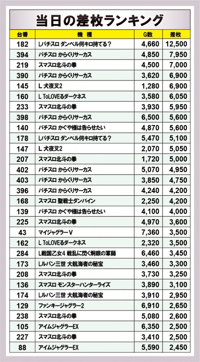 『Lパチスロ ダンベル何キロ持てる?』から万枚OVERが放たれ、さらに『パチスロ からくりサーカス』が7,000枚OVERとSANKYO機種が流石のポテンシャルを披露。ほかにも『スマスロ北斗の拳』『L 犬夜叉2』『L ToLOVEるダークネス』など人気機種が軒並み名を連ねており、大きな熱気はファンを奮い立たせ、その結果としてあらゆる台で終日を通して打ち込まれたようだ。