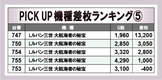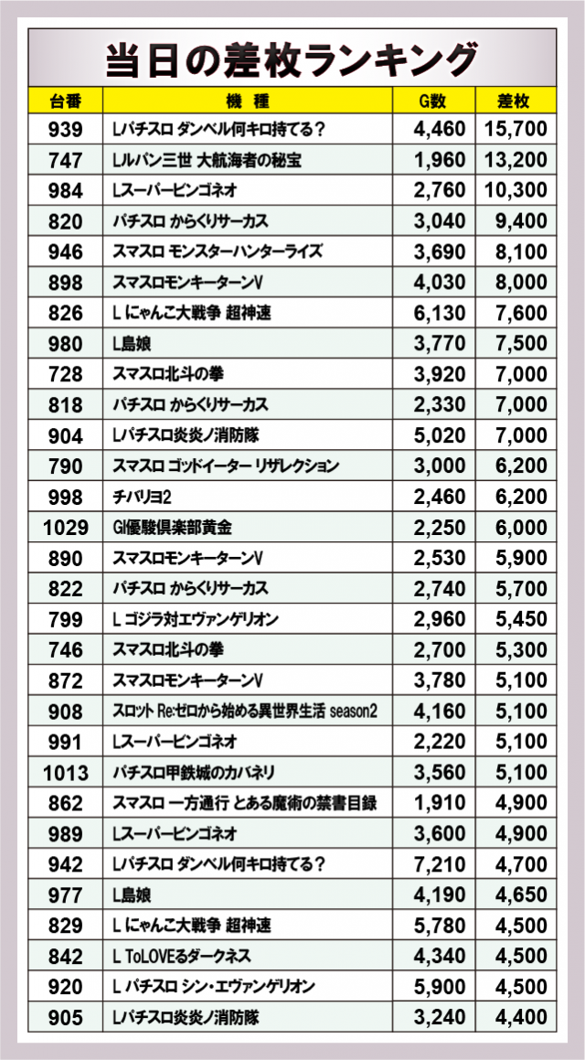 『Lパチスロ ダンベル何キロ持てる?』『Lルパン三世 大航海者の秘宝』『Lスーパービンゴネオ』から計3台の万枚OVERが発生し、ホール内で注目の的となっていた。また、上表は4,000枚OVERからとなっており、各コーナーで打ちごたえのある展開に歓喜したファンも多かったはずだ。