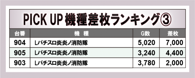 万枚OVERを達成した『Lスーパービンゴネオ』『Lパチスロ ダンベル何キロ持てる?』『Lルパン三世 大航海者の秘宝』は、まとまった出玉獲得台が複数生まれ、店内の盛り上がりを牽引していた存在と言えるだろう。他にも存在感を放っていた機種が多々あるが、全台プラス差枚をマークした『Lパチスロ炎炎ノ消防隊』の高いパフォーマンスは見逃せない。さらに、スマスロ機に負けず劣らず奮闘していた『アイムジャグラーEX』も終日を通して打ち込まれた事実を確認でき、有意義な時間を過ごしていたのは確かだ。