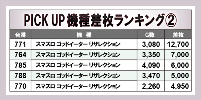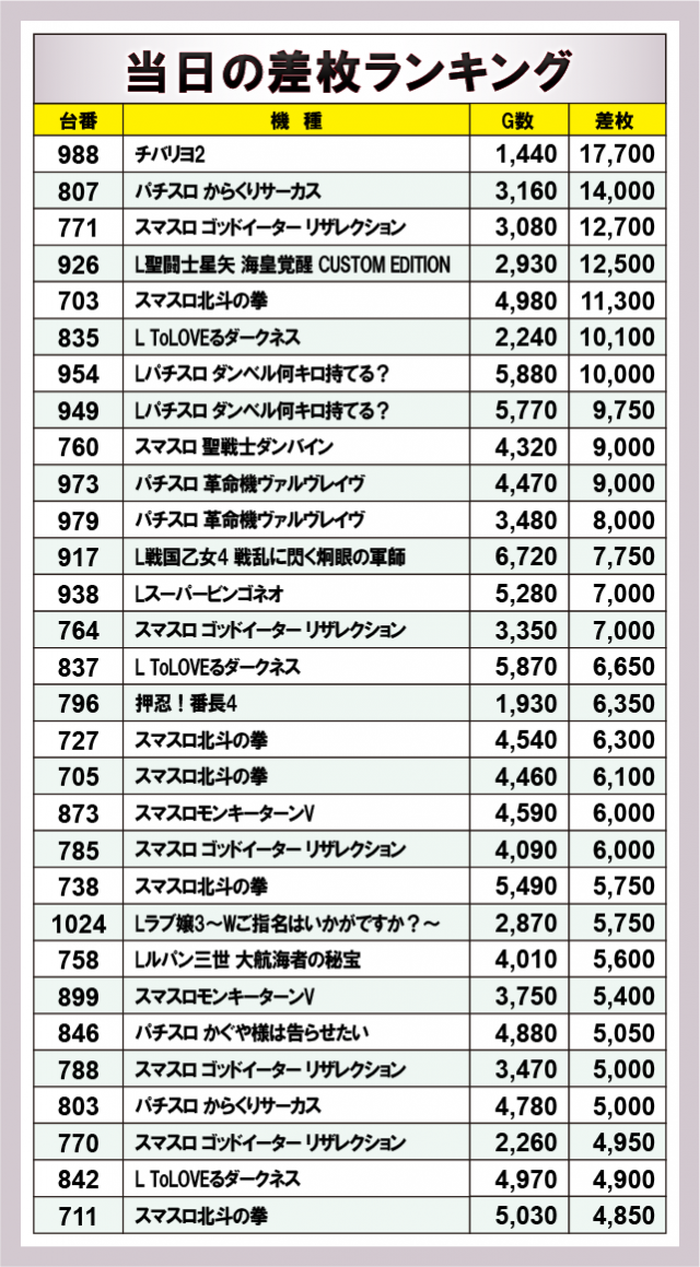 上表をご覧の通り、TOP30は4,000枚OVERから名を連ねており、ファンは手応えを感じながら遊技を楽しめたはずだ。その中から万枚OVER台は7台生まれ、さらに万枚まであと一歩の台も確認できるなど、想像以上の熱量にファンは啞然としながらも、嬉々としてレバーを叩いていたことだろう。