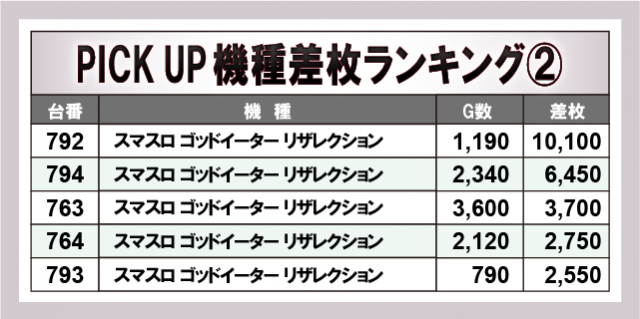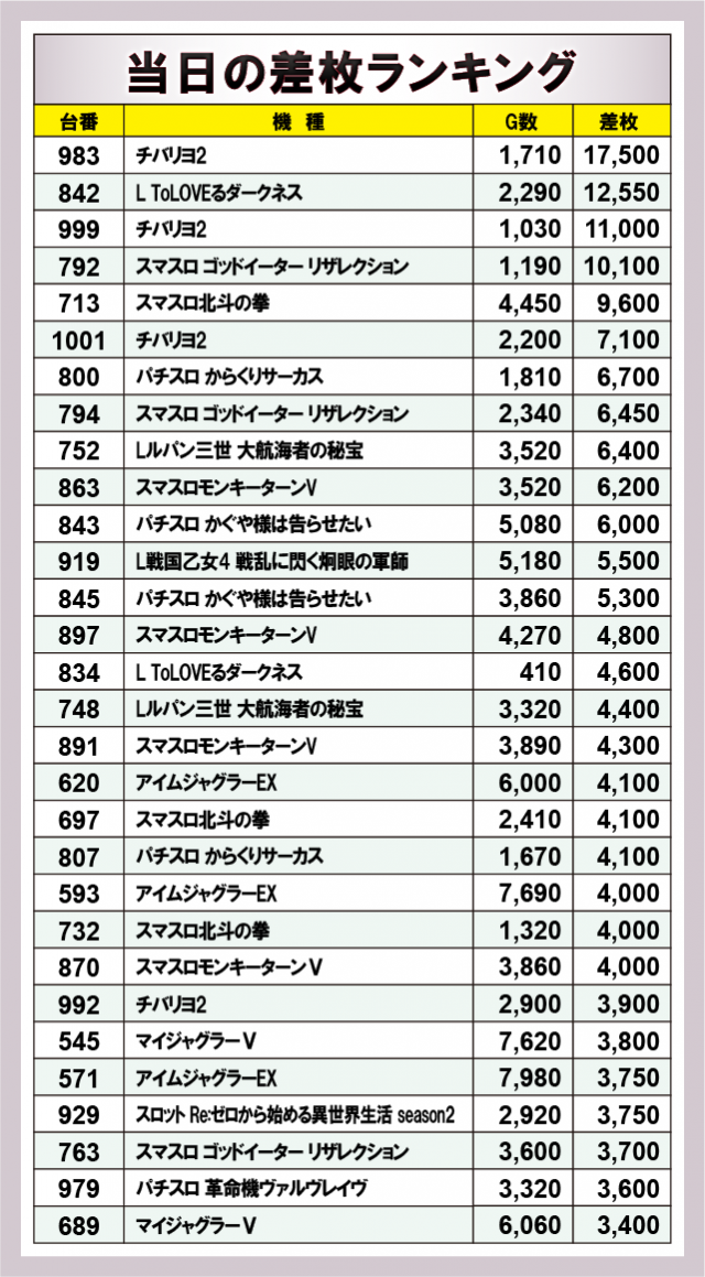 『L ToLOVEるダークネス』『スマスロ ゴッドイーター リザレクション』『チバリヨ2』では、万枚OVER台のほかにも目を見張る活躍を披露した台が多く、熱気が噴出していたのはもちろん、高い活気にも満ちていたのが印象的だ。また『ジャグラー』シリーズから、『アイムジャグラーEX』で4,000枚OVERが2台、『マイジャグラーⅤ』で3,000枚OVERが3台生まれ、打ちごたえのある状況が整っていたと言える。