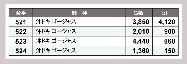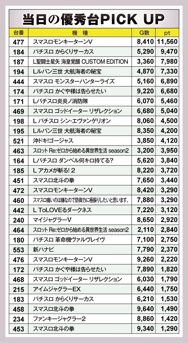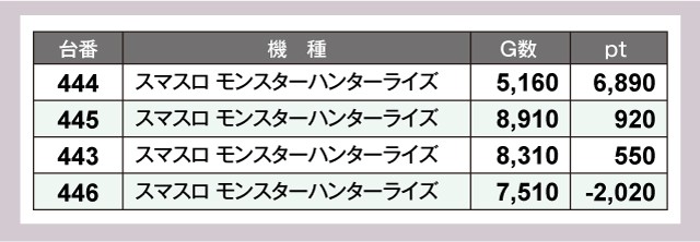『パチスロ からくりサーカス』は184番台が+9,470pt、『スマスロ モンスターハンターライズ』は444番台が+6,890ptなど数々の人気機種が活躍を見せており、スロットコーナーを大いに盛り上げていた。