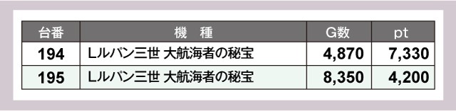 『Lルパン三世 大航海者の秘宝』は194番台+7,330pt、195番台+4,200ptと揃って優秀な結果を残している。
