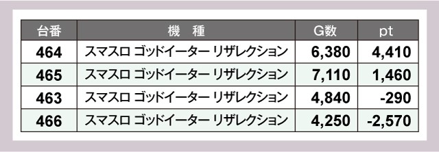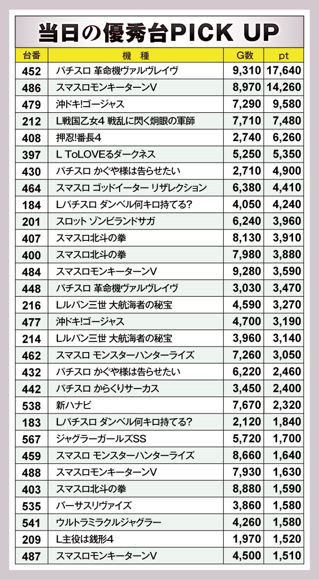 店内をチェックすると、452番台『パチスロ 革命機ヴァルヴレイヴ』の+17,640ptを筆頭に、486番台『スマスロモンキーターンV』は+14,260pt、479番台『沖ドキ!ゴージャス』は+9,580ptと素晴らしい結果を残している。