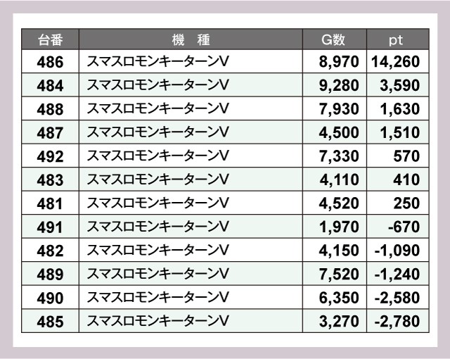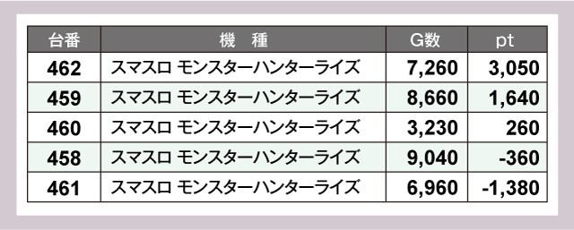 『スマスロモンキーターンV』はランキング2位の486番台+14,260ptをはじめ、優秀台が複数見られた。