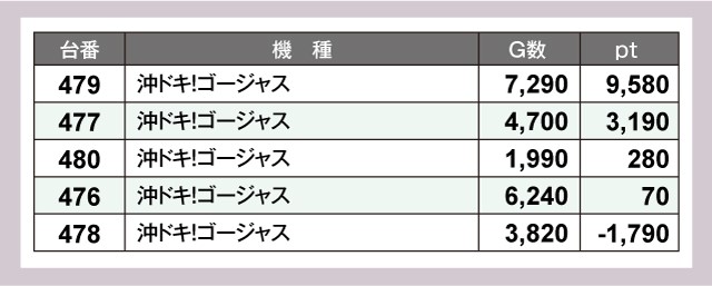 『沖ドキ!ゴージャス』は5台中4台がプラスで終了。479番台は+9,580ptと圧巻の内容だった。