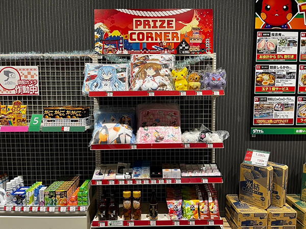 景品コーナーには食品類やキャラクターグッズなど多彩なアイテムが並んでおり、プレイヤーたちの興味を引いていた。