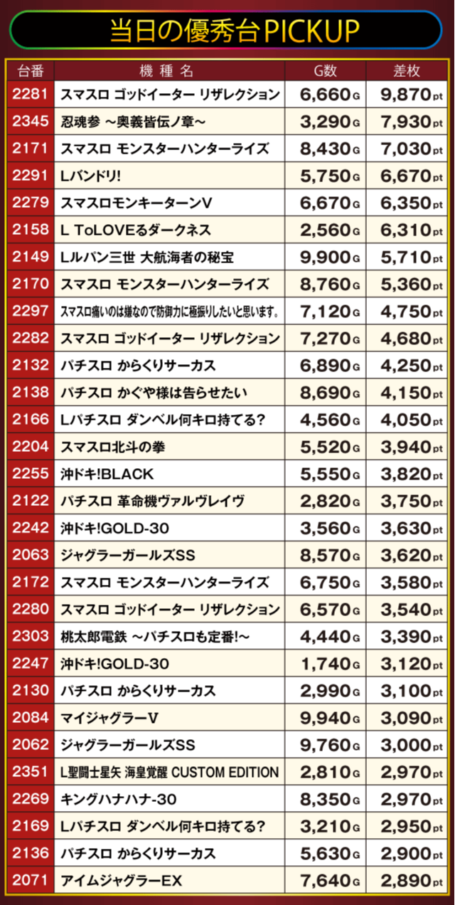 この日、最もプレイヤーの注目を集めたのが『スマスロ ゴッドイーター リザレクション』で、万枚目前の+9,000pt超を叩き出しランキングトップに輝いた。次いで『忍魂参 ~奥義皆伝ノ章~』と『スマスロ モンスターハンターライズ』が+7,000pt超を記録している。