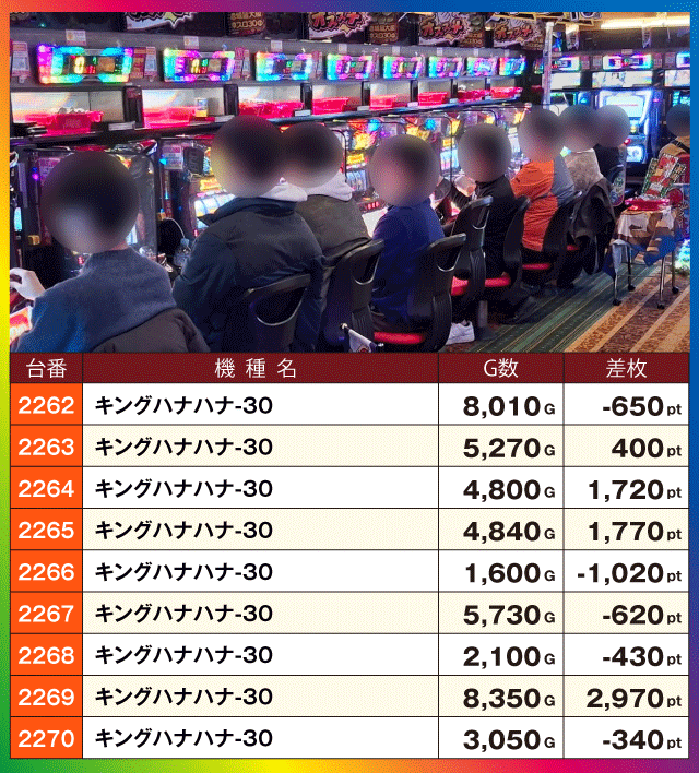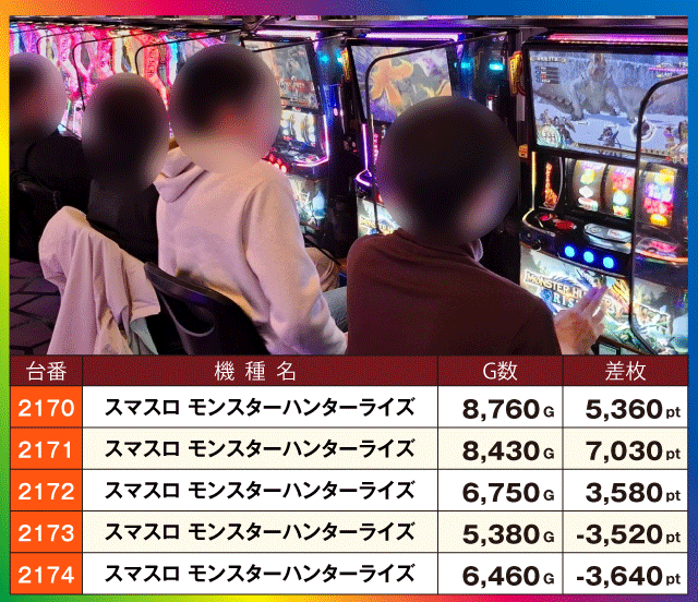 次に注目機種の状況をチェックすると、『スマスロ モンスターハンターライズ』は全5台中3台、沖スロの『沖ドキ!BLACK』と『キングハナハナ-30』は約半数の台がプラス差枚となっている。そして、ランキングトップの『スマスロ ゴッドイーター リザレクション』は、他にも+4,000pt超に+3,000pt超、『ジャグラーガールズSS』からは+3,000pt超が2台も発生する盛況ぶりを見せていた。