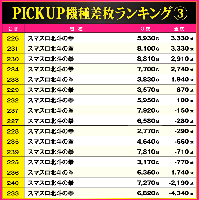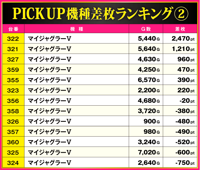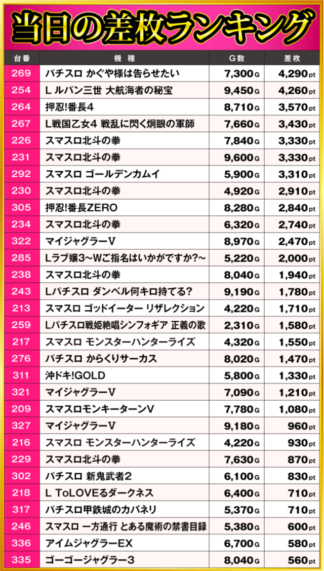 次にPICK UP機種の状況を見てみると『スマスロ モンスターハンターライズ』は3台中2台、『マイジャグラー』は約半数の台がプラス差枚で終了するという見事な結果を残している。また、『スマスロ北斗の拳』からは+3,000pt超が2台、+2,000pt超が2台も発生する盛況ぶりであった。