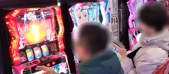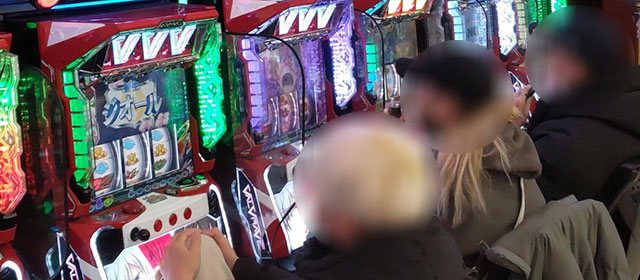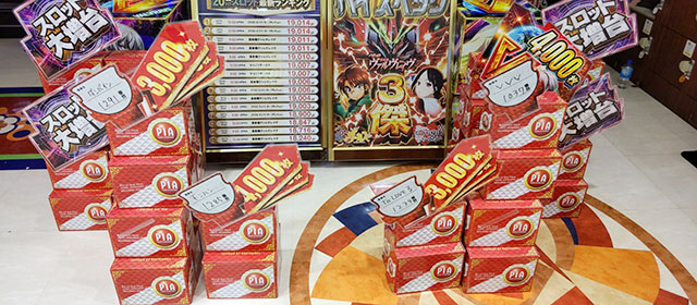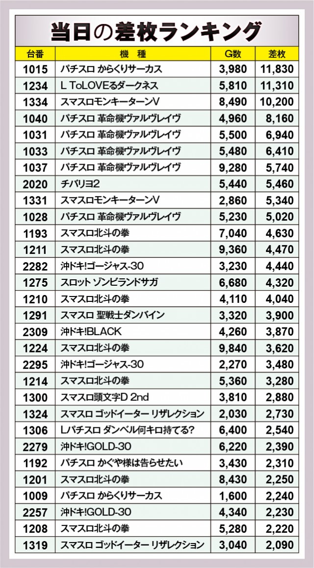 『パチスロ からくりサーカス』『L ToLOVEるダークネス』『スマスロモンキーターンV』にて万枚OVERが発生し、店内の盛り上がりをリードする存在となっていた。その後ろには『パチスロ 革命機ヴァルヴレイヴ』が並び、いずれも大台突破台だったことから、凄まじい熱気を感じることができる。朝から閉店まで打ち込まれた台を確認できることから、ファンは好感触を得ながらレバーを叩いていたに違いない。