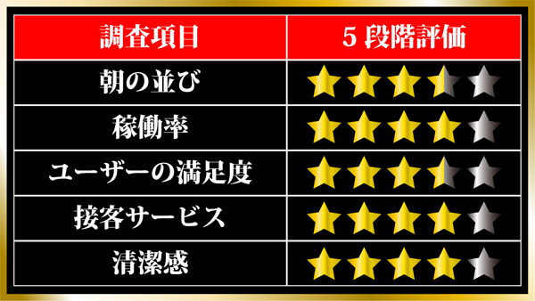 「CR牙狼 金色になれ」や「CRぱちんこウルトラバトル烈伝 戦えゼロ!若き最強戦士」などのMAXタイプには好調な台が多数あり、シマ一帯が笑顔にあふれていた。なかでも「ぱちんこCR北斗の拳6 拳王」と「CRぱちんこ仮面ライダーV3」を打つプレイヤーの嬉しそうな表情が印象に残っている。