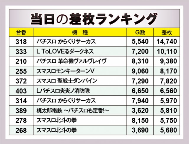 『パチスロ からくりサーカス』『L ToLOVEるダークネス』から万枚OVERが発生し、当日の店内の盛り上がりをリード。さらに『パチスロ 革命機ヴァルヴレイヴ』が9,000枚OVERと万枚に近づく熱量を披露し、ファンは大きな高揚感を抑えきれなかったことだろう。大台突破台もまた多く、回転数の高さが裏付けているように、打ちごたえのある環境が整っていたようだ。
