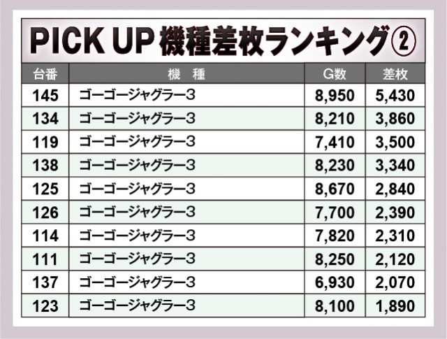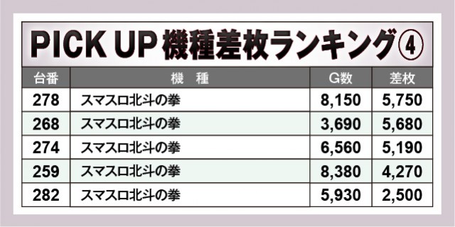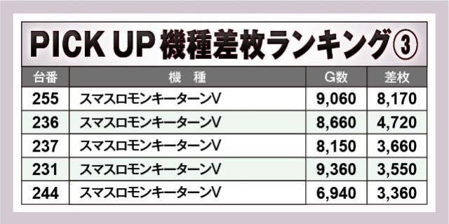 屈指の人気を持つ『スマスロモンキーターンV』『スマスロ北斗の拳』は、終日を通して打ち込まれただけでなく、8,000枚OVERなど大きな熱気を放っていた。そして『アイムジャグラーEX』『ゴーゴージャグラー3』も回転数と差枚数が比例する展開を見せ、これら4機種は凄まじい盛り上がりを披露。優秀機種の名に恥じない活躍だったと断言できる内容で、遊技していたファンの満足度は高かったはずだ。