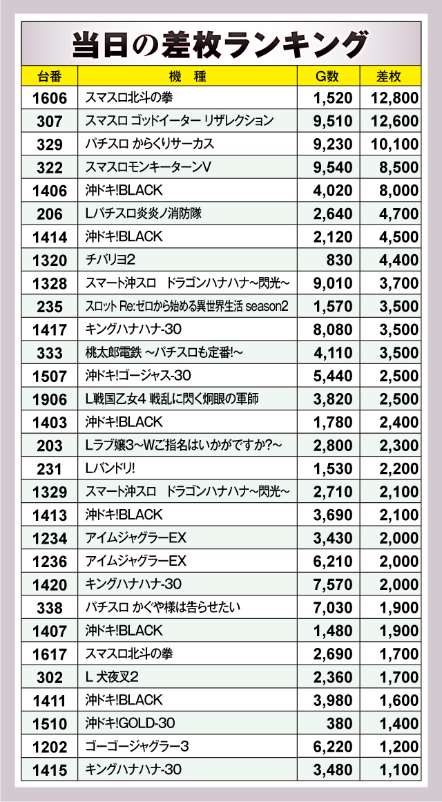 まずは差枚ランキングトップ30台のチェックから。30台のうち22台が+2,000枚オーバーを記録し、+3,000枚オーバーは12台出現! それらのなかでもっとも優秀だったのは、1606番台の「スマスロ北斗の拳」で、差枚は+12,800枚と大台突破の素晴らしい記録をマーク! その他ランクイン機種には、人気スマスロ機種をはじめジャグラーシリーズや沖ドキシリーズなど、店内のあらゆる機種にチャンスがあったようだ!