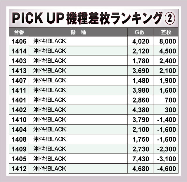 続いては、当日とくに盛り上がっていた3機種を紹介。3機種とも好記録が続出していたが、それらのなかでも「沖ドキ!BLACK」は、ピックアップ14台のうち6台が差枚+1,000枚オーバーと素晴らしい結果を残していた。もちろんその他2機種を含め、店内全体に良台を確認することができた!