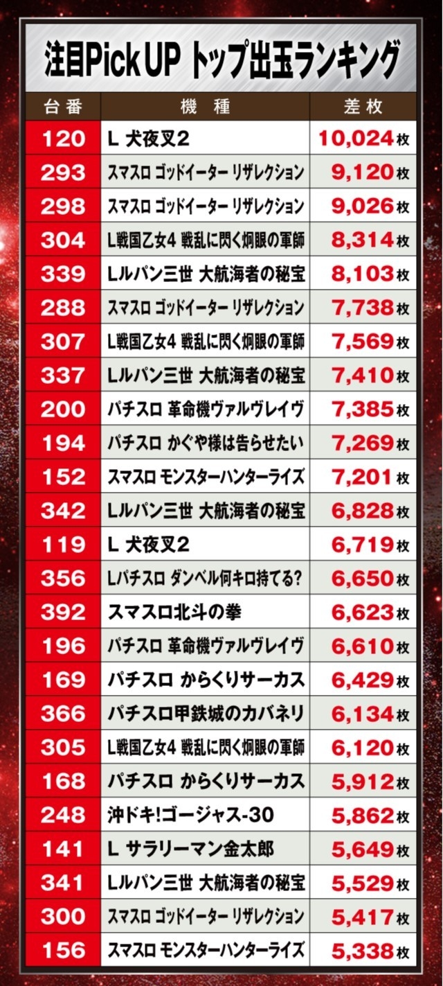 この日、最もプレイヤーの注目を集めたのが『L 犬夜叉2』で、万枚超の+10,024枚を叩き出しランキングトップに。次いで『スマスロ ゴッドイーター リザレクション』から+9,000枚超が2台出現と、ランキングベスト3が非常にハイレベルな結果を残した。