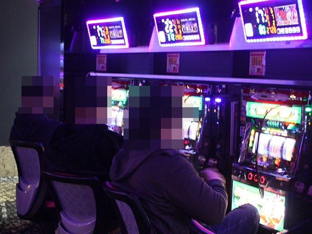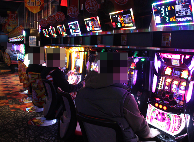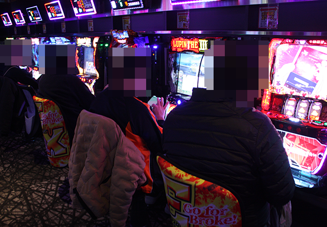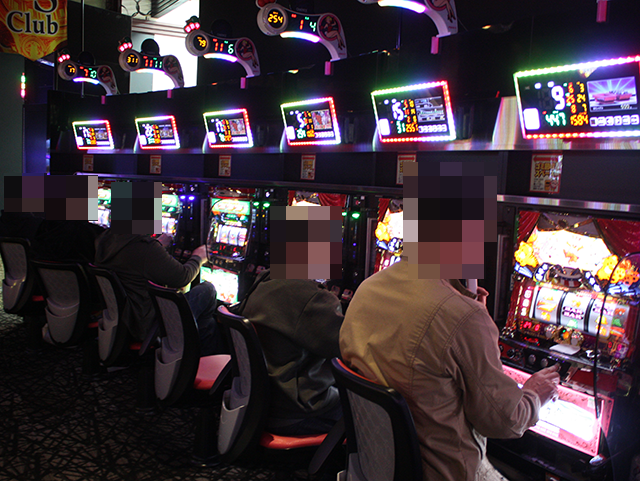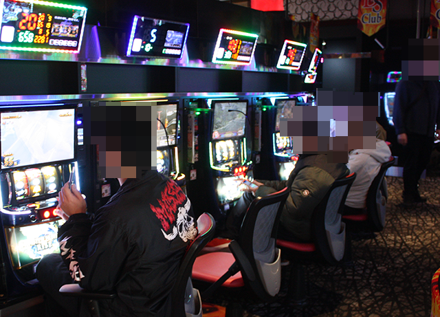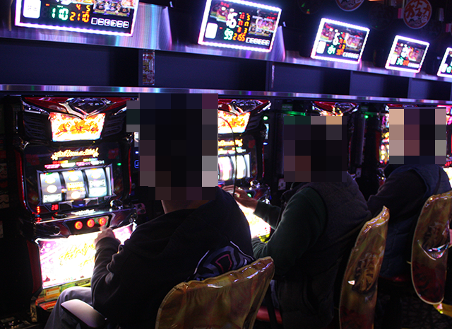 「沖ドキ!BLACK」でも、プレイヤーたちが持ち玉で遊技中。