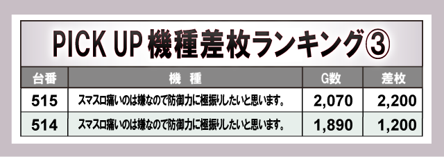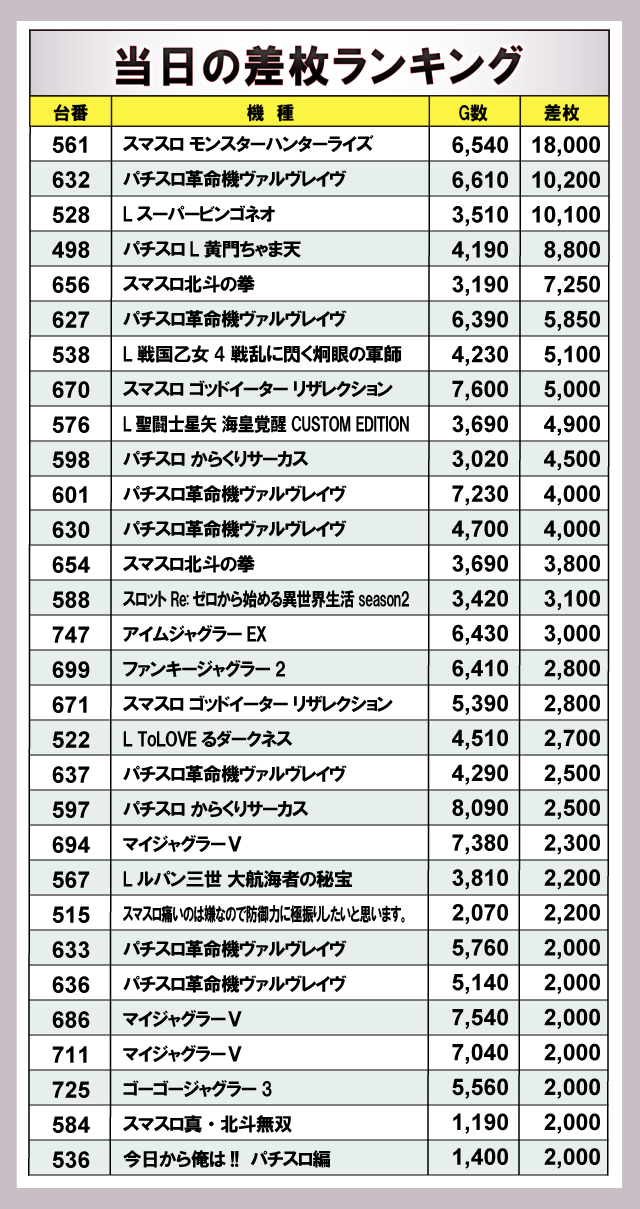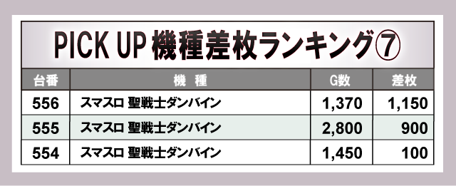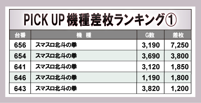 今回、活躍の中心となったのは上記の7機種。『スマスロ北斗の拳』は中でも安定した結果を残していることがわかる。次点で優秀な活躍を見せていたのが『ゴーゴージャグラー3』。しっかりと打ち込まれていることからも良い内容であったことが窺える。今回は、AT機・ノーマル機のどちらにもチャンスが用意されていた。