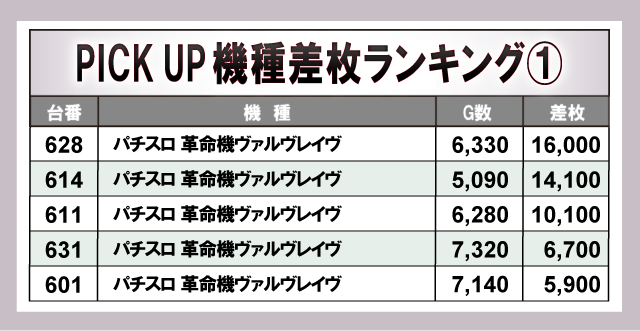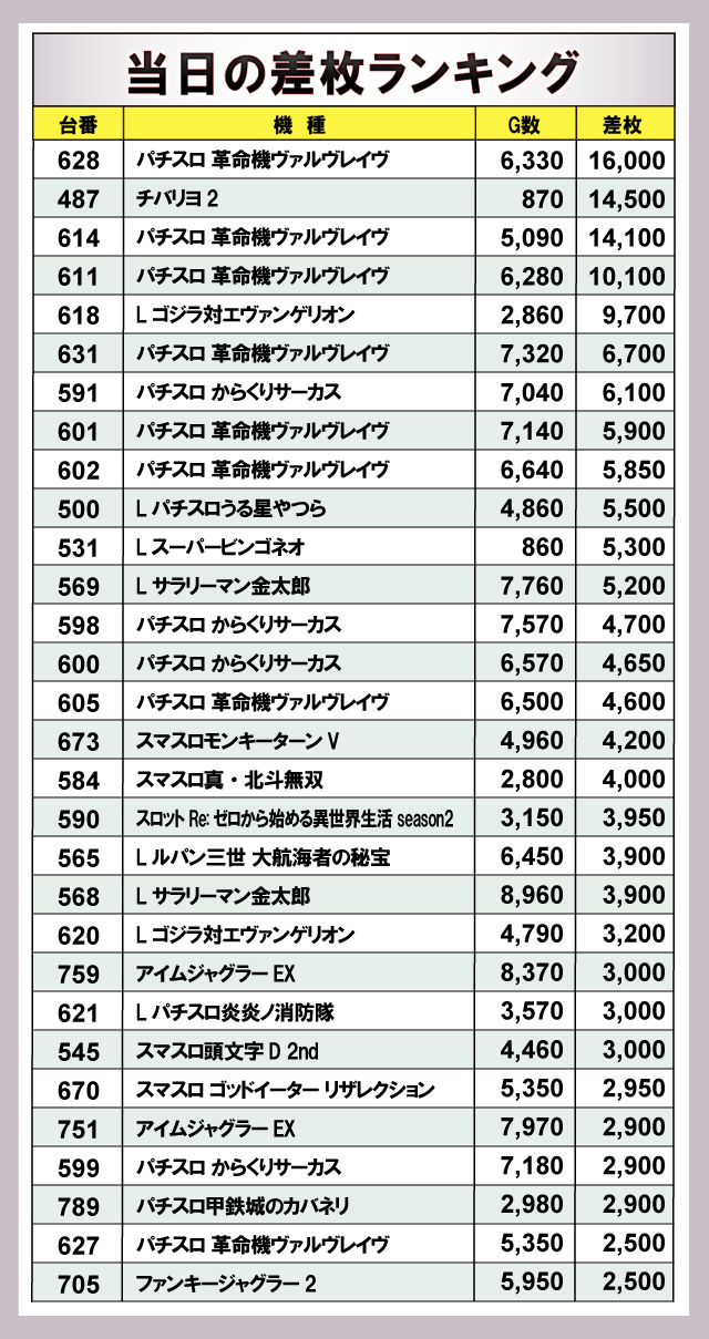 『パチスロ 革命機ヴァルヴレイヴ』、『チバリヨ2』から合計4台の万枚OVERが発生!その内の3台が『パチスロ 革命機ヴァルヴレイヴ』という圧倒的な熱量を披露していた。全体的にまとまった出玉を確保しており、ファンは恍惚の表情を浮かべていたはずだ。