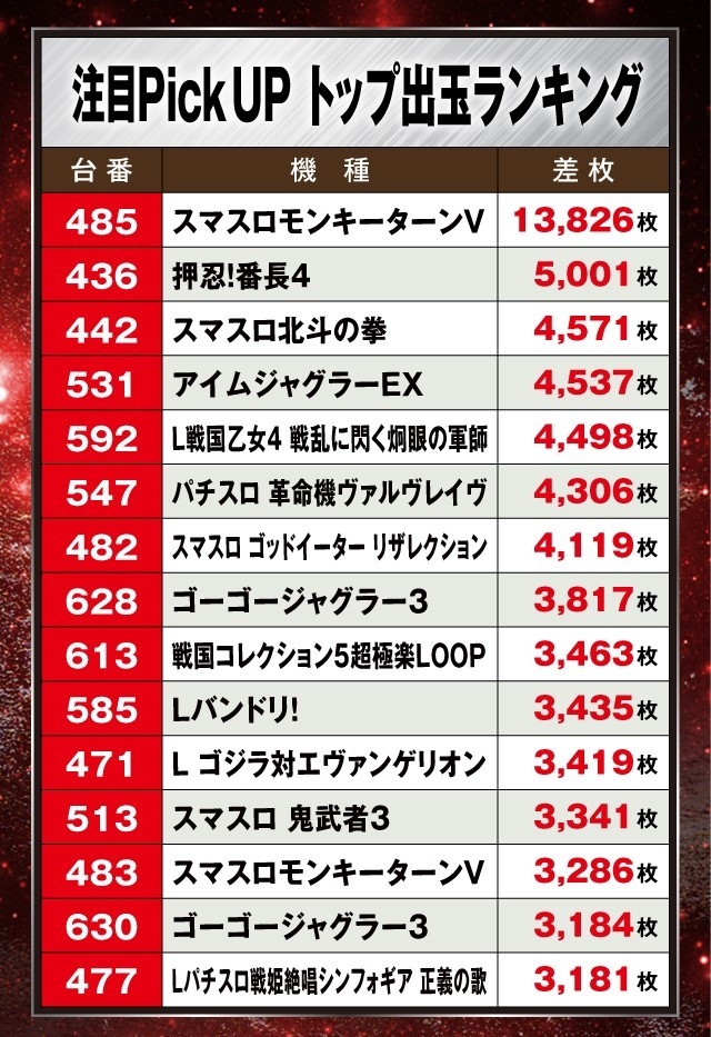 この日の店内状況をチェックすると、『スマスロモンキーターンV』が+13,826枚を叩き出しランキングトップに。次いで『押忍!番長4』で+5,001枚、『スマスロ北斗の拳』で+4,571枚と、人気のスマスロを中心に多数の好調台を確認できた。