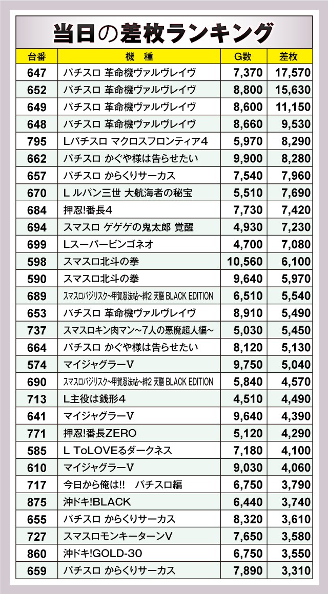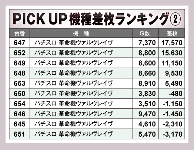 この日は、人気のスマスロを中心に好調台を多数確認。そんな中、圧巻のパフォーマンスを披露していたのが『パチスロ 革命機ヴァルヴレイヴ』であった。647番台の+17,570枚を筆頭に万枚超が続出、続く4位も万枚目前の+9,530枚を記録しランキング上位を独占する盛況ぶりを見せている。