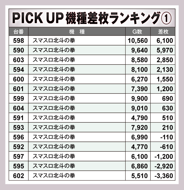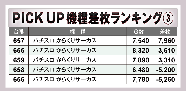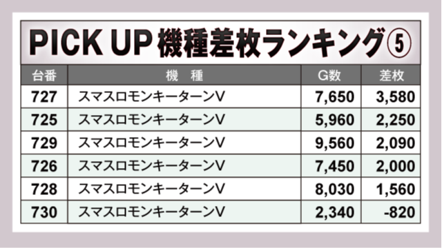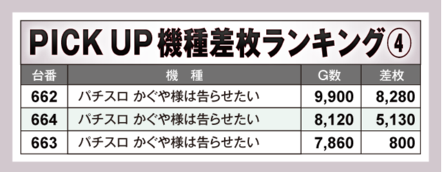 次にPICK UP機種をチェックすると、『スマスロ北斗の拳』からは+5,000枚超が2台、『パチスロ からくりサーカス』で+7,960枚、『パチスロ かぐや様は告らせたい』で+8,280枚と、各機種がその実力を遺憾なく発揮。また、『スマスロモンキーターンV』は全6台中5台がプラス差枚で終了する安定感を見せつけていた。