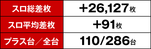 毎度RED取材の都度、大量のプラス台を生み出してくれるが、今回のプラス差枚の総台数は110台!前回が91台だったので、19台も増えたことになる。その勝率は38.5%と極めて高く、10,000枚超えレコードも前回を上回る2台が誕生した。