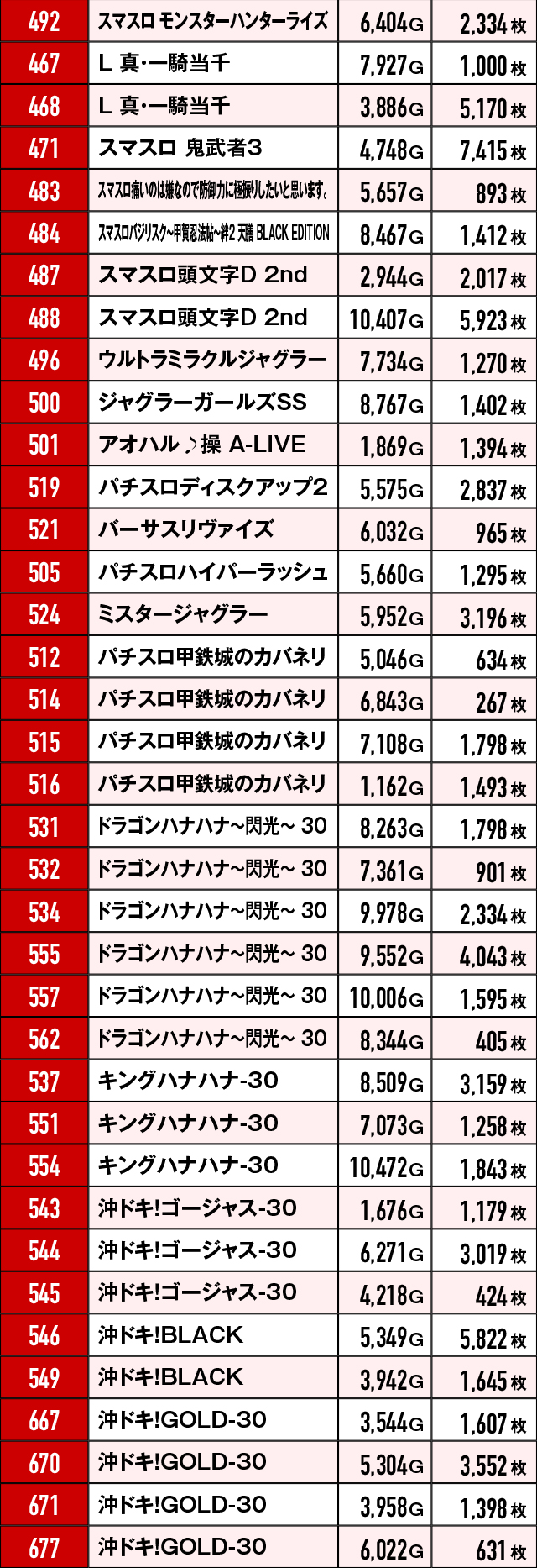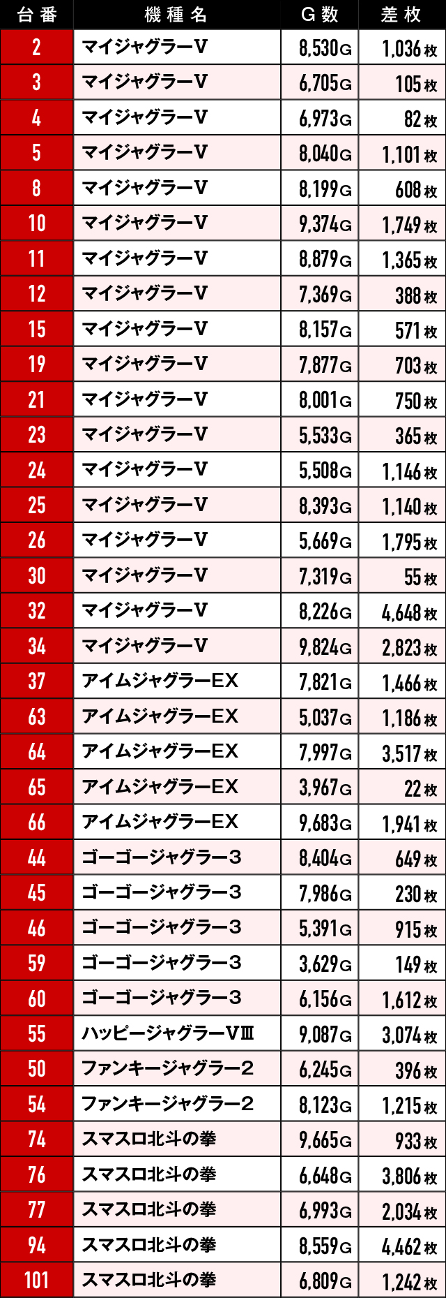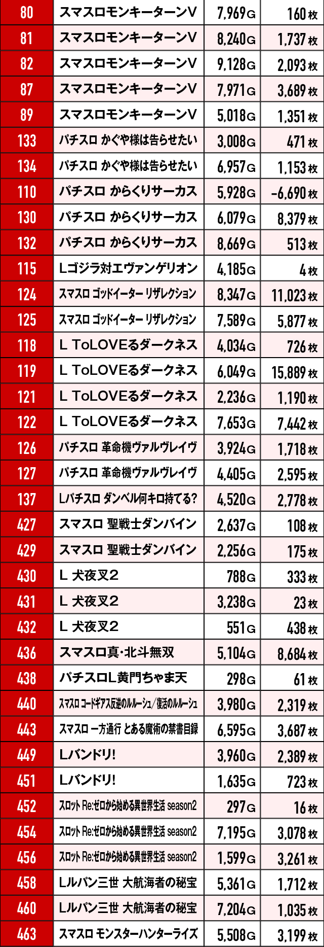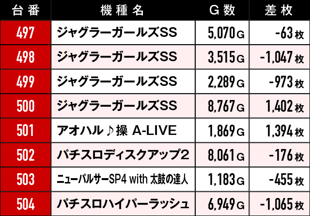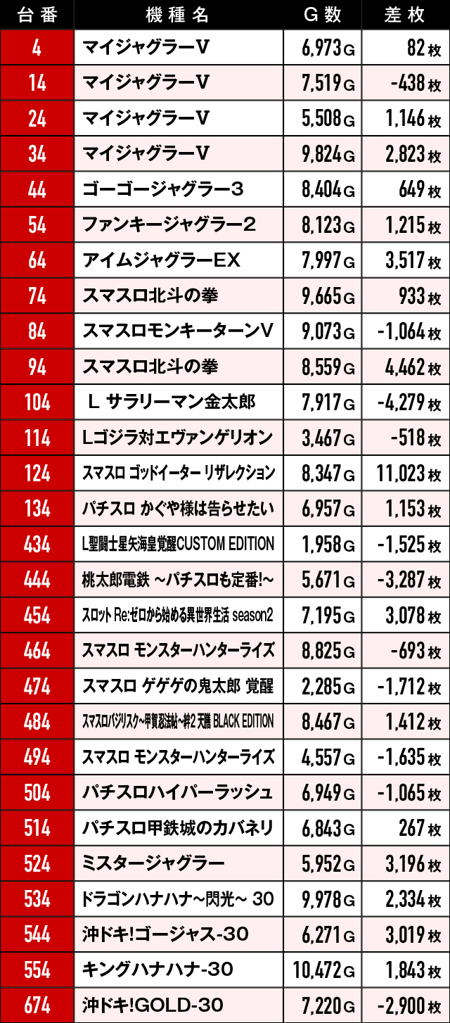 今回もお目当ての台すべてがプラスになるわけもなく、惜しくもマイナス域に沈んでしまった台たちがいる。3台並んで好挙動ながらマイナスになってしまった台、8台並びの中でマイナスになってしまった台など様々。さらにプラス台の多かった台番をリサーチしたところ、驚きのヒミツに辿り着いてしまった…!