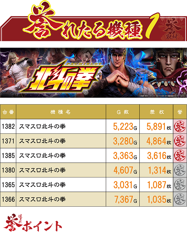 赤誉マーキング(=3,000枚以上)を3台も生み落としたのは『スマスロ北斗の拳』。TOP30記録に3台がランクインする活躍で、相変わらずの強さを発揮してくれた。やはり多台数機種は強い…!?