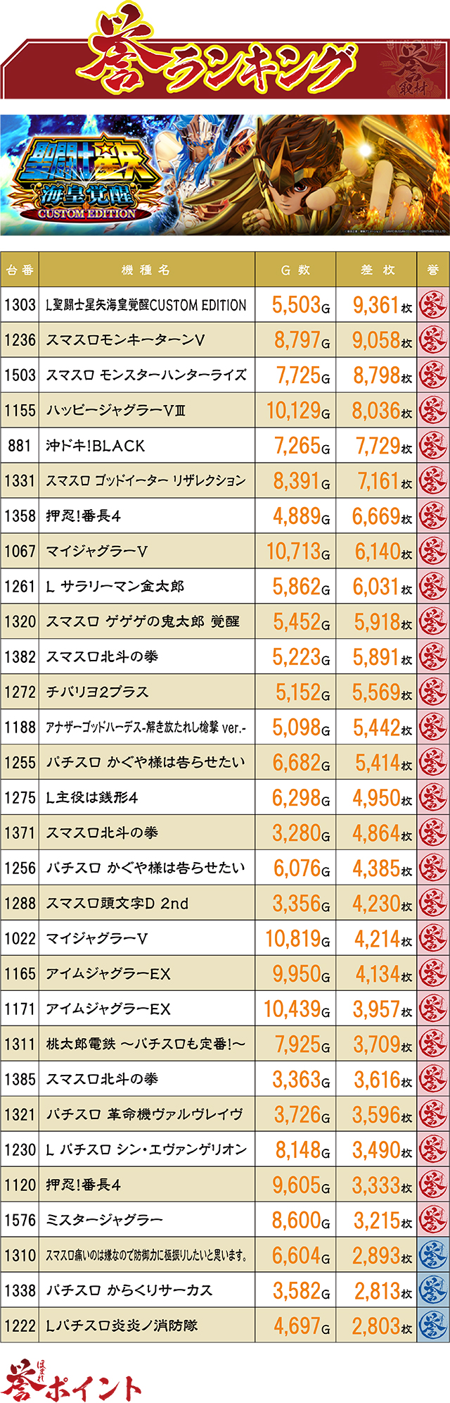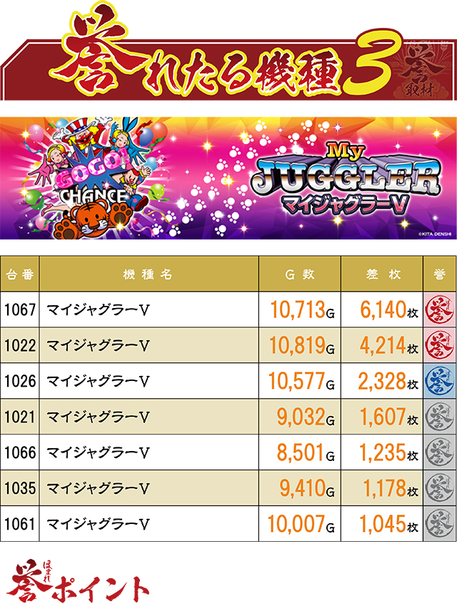 残念ながら今回は10,000枚超えレコードには出会えなかったが、それでも誉ランキングの1・2位が揃って9,000枚オーバーの快挙を達成!続く3・4位も8,000枚超えと、ランキング上位を高い差枚数値が席巻した。注目は8,000枚オーバー記録を生み出した『ハッピージャグラーⅤⅢ』!