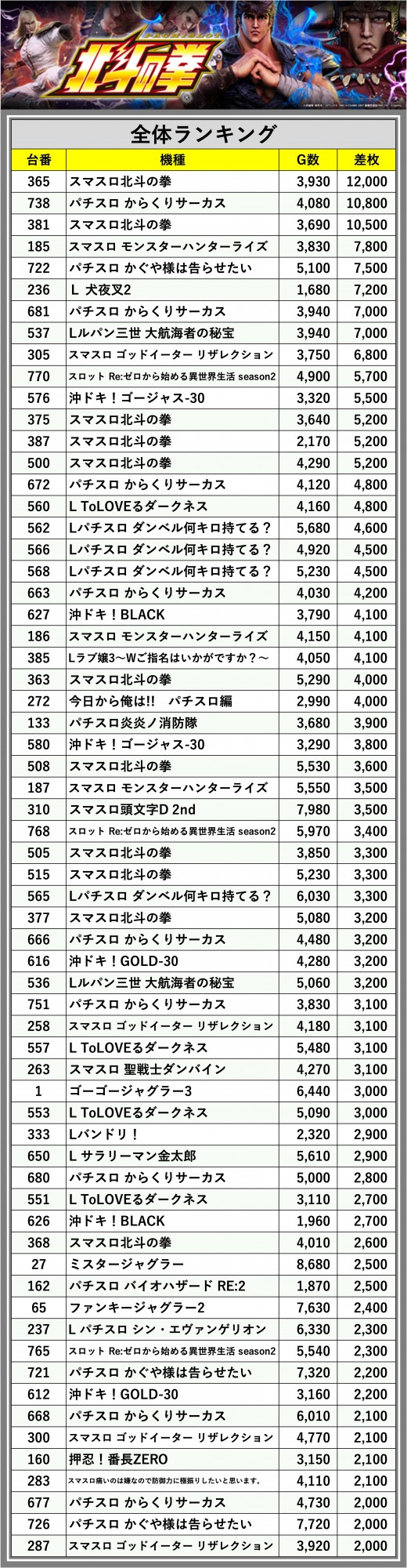 厳選された取材対象機種をはじめ、その他スロット全体から好記録が飛び出した!プレイヤーが楽しんだ1日を下記データにて振り返ってみて欲しい。