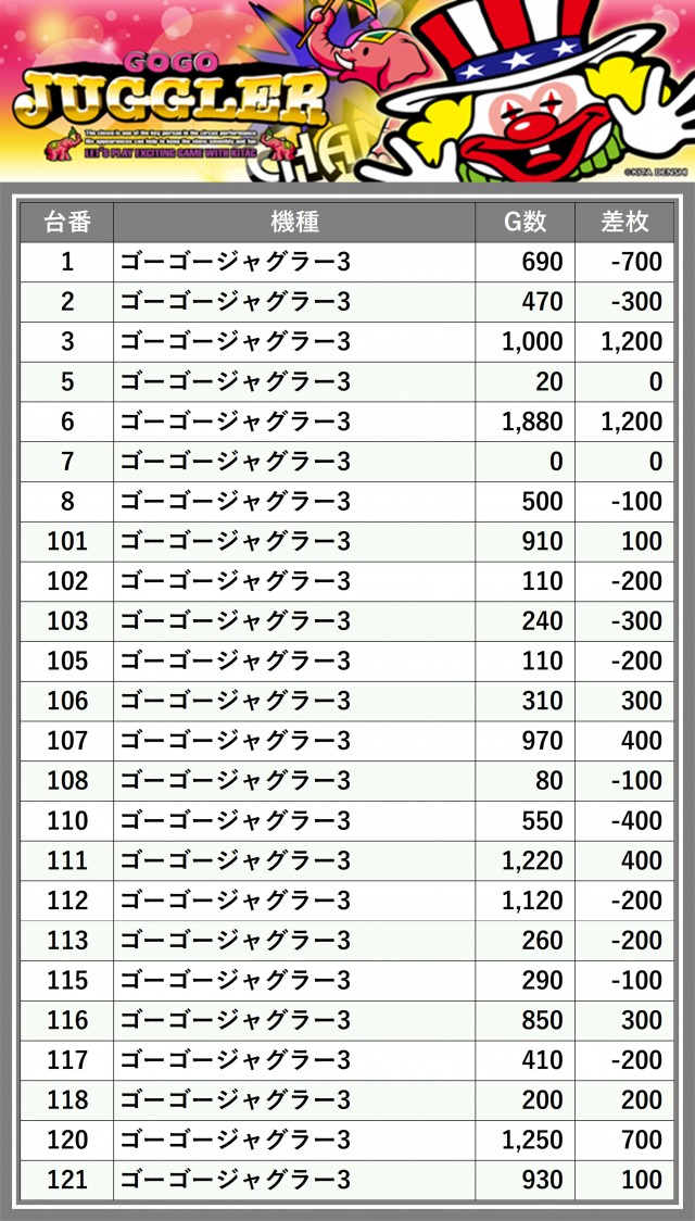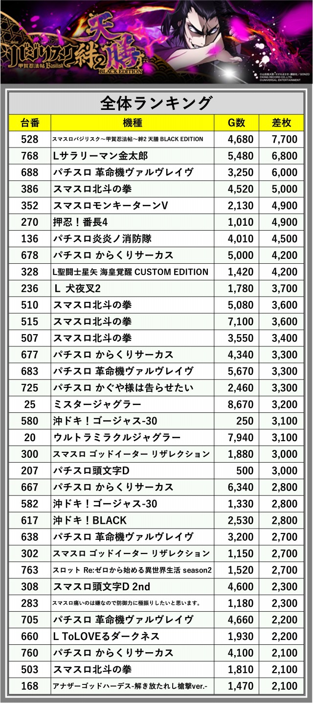 厳選された取材対象機種をはじめ、その他スロット全体から好記録が飛び出した!プレイヤーが楽しんだ1日を下記データにて振り返ってみて欲しい。