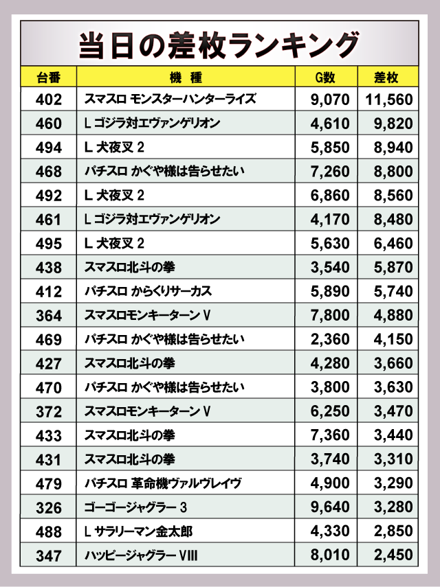 ※差枚数順に掲載しています。