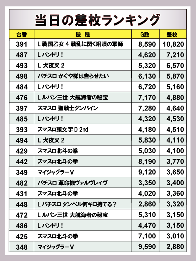 ※差枚数順に掲載しています。
