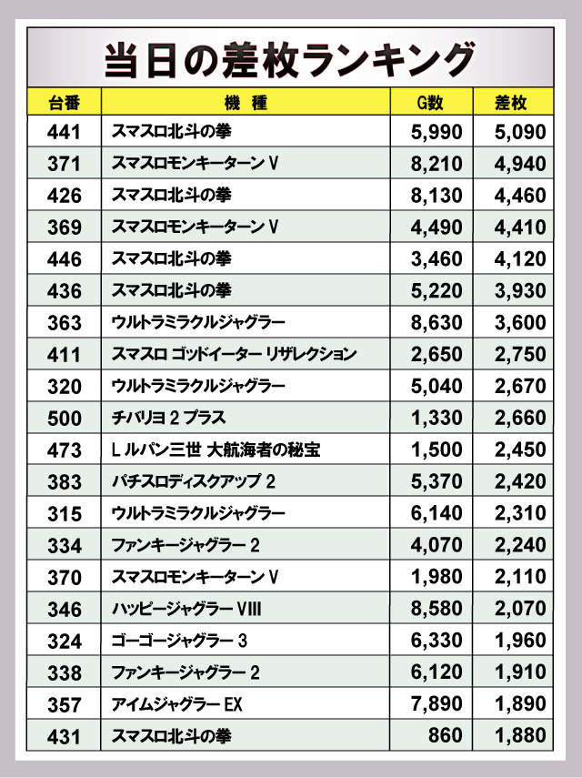 ※差枚数順に掲載しています。