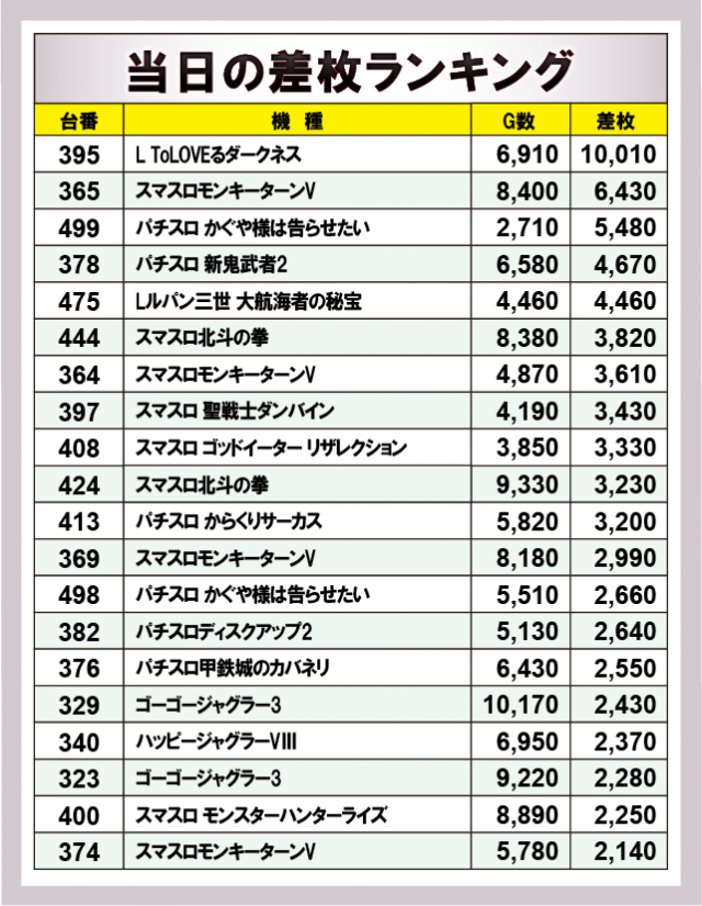 『ベニス布施本館・新館』にて15回目の実施となった「GRAND OPENの軌跡」。この日は『L ToLOVEるダークネス』から万枚OVERが発生し、店内の盛り上がりに大きく貢献していた。また機種別ランキングでは『ジャグラー』シリーズがランクインしており幅広い機種にチャンスがあったことが窺える。今後の躍進にも期待できるばかりで、引き続き同店の動向には注目して頂くことを強くおすすめする!