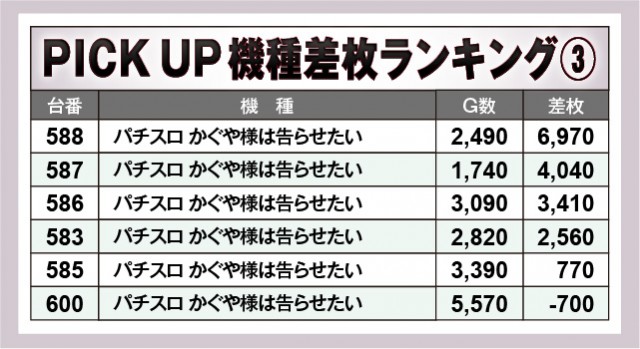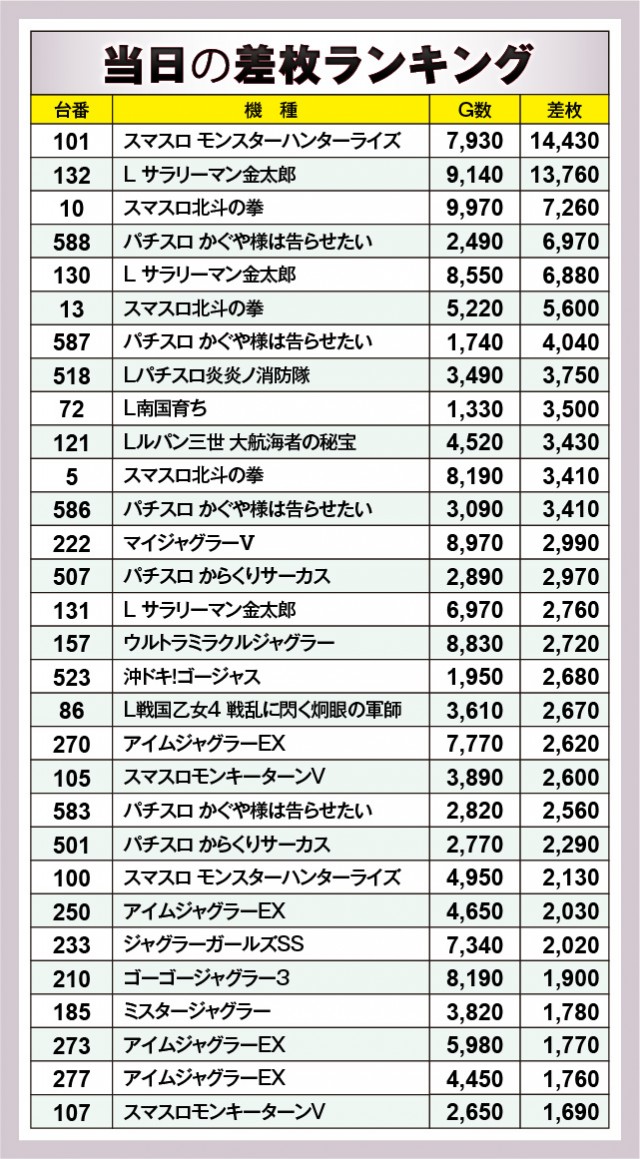 注目度の高い新台『L サラリーマン金太郎』が万枚OVERの活躍を披露するだけでなく、全台プラス差枚数を達成するという偉業をみせた。ほかにも『スマスロ北斗の拳』『パチスロ かぐや様は告らせたい』『スマスロ モンスターハンターライズ』が高いパフォーマンスを発揮して、大きなマイナスを作らない安定した内容を披露。いずれも力強くレバーが叩ける状況で、ファンは思わず笑みを浮かべていたことだろう。