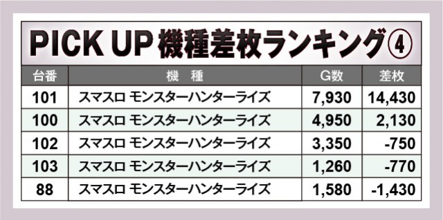 『スマスロ モンスターハンターライズ』『L サラリーマン金太郎』にて万枚OVERが飛び出しており、店内の熱気を大きくリード。5,000枚OVERの大台突破台も確認でき、さらには8~9,000回転台など終日を通して打ち込まれた台の多さも鮮烈だ。ファンは打ちごたえのある環境に高い満足度を示し、時間の許す限りレバーを叩いていたことだろう。