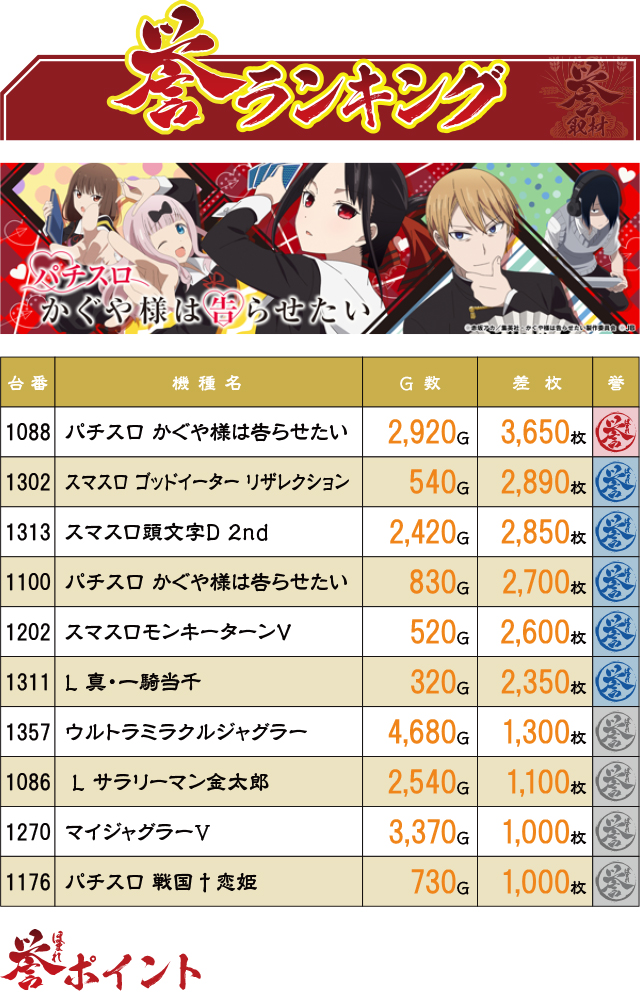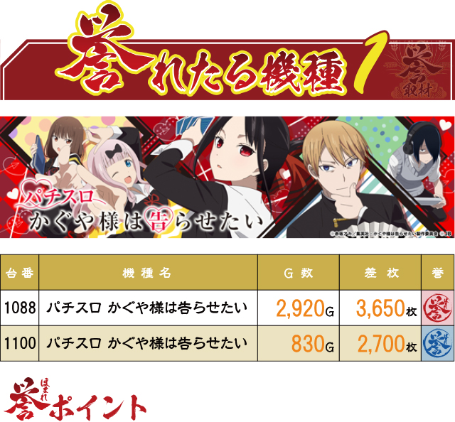 前回も誉ランキング3位入賞の『パチスロ かぐや様は告らせたい』から、2台の誉レコードが誕生。2台とも思いっきり回されていたら、さらに差枚記録を伸ばしていたように思える内容だった。