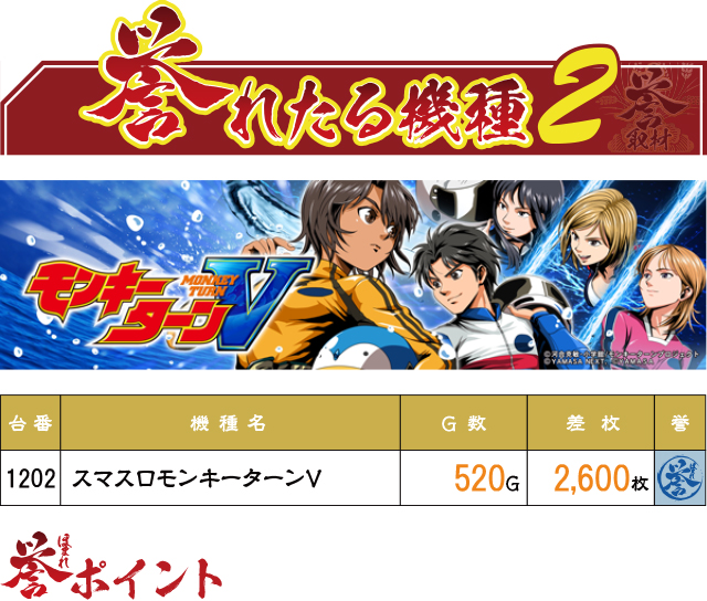 『スマスロモンキーターンV』の1202番台が青誉マーク(=2,000枚以上)となっていたが、こちらも総ゲーム数は少なめ。誉取材の日は必然的にチャンスが多くなるため、ブン回しが必須!