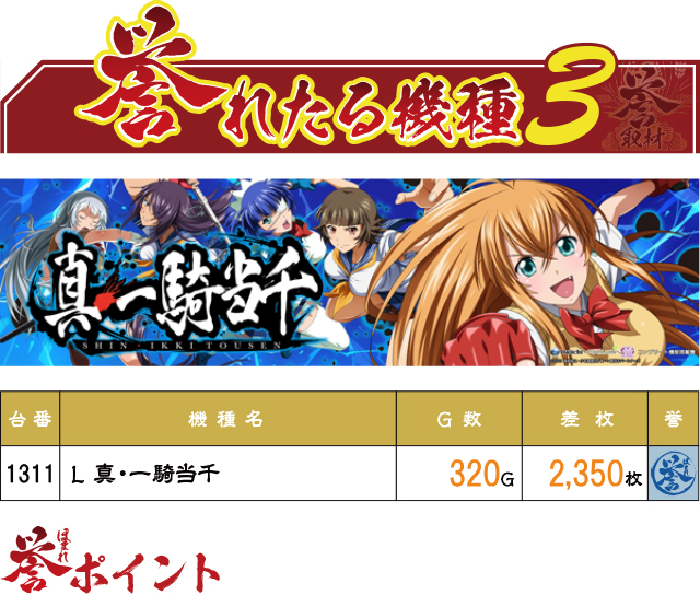 バラエティーコーナーに1台設置の『L 新・一騎当千』からも誉レコードが出現!だがしかしこちらの台も総ゲーム数不足が顕著であり、十分な可能性を秘めていただけに勿体ない結果となった。
